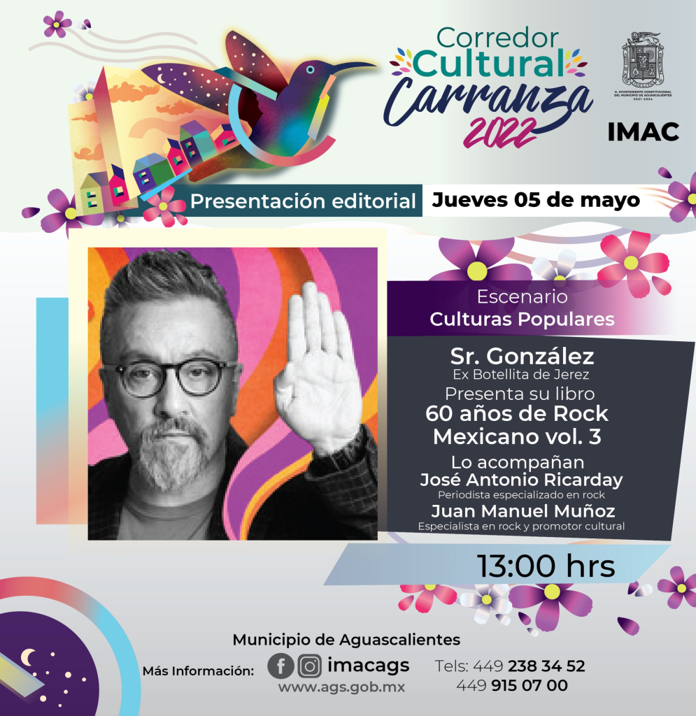 El Instituto Municipal Aguascalentense para la Cultura (IMAC), invita a la presentación editorial «60 años de Rock Mexicano» vol. 3, del Sr. González (ex integrante del grupo Botellita de Jerez), que se realizará el jueves 5 de mayo a las 13:00 horas, en el Escenario de Culturas Populares, del Corredor Cultural Carranza.