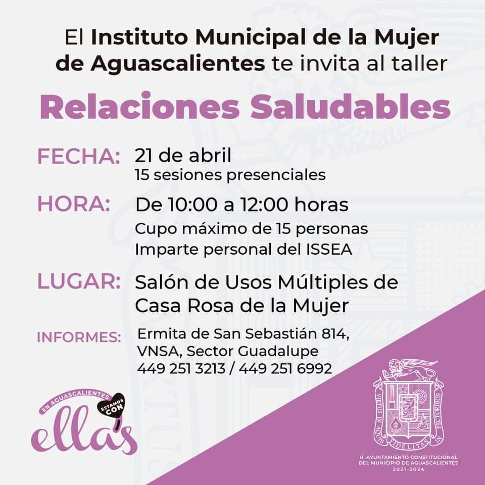 Este curso se llevará a cabo en coordinación con el Instituto de Servicios de Salud del Estado de Aguascalientes (ISSEA), los jueves a partir del 21 de abril, la modalidad es presencial, está integrado por 15 sesiones de 90 minutos cada una, se impartirá de 10:00 a 12:00 horas, en la Casa Rosa de la Mujer de Villas de Nuestra Señora de la Asunción, ubicada en Ermita de San Sebastián # 814, sector Guadalupe.