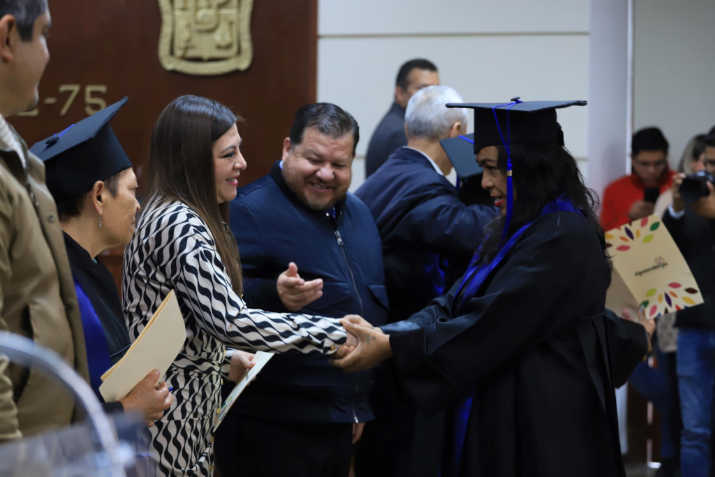 Por su parte, María Hilda Ramírez Torres, de la Secretaría de Desarrollo Social, quien a sus 69 años de edad recibió su certificado de secundaria, agradeció el apoyo de su familia y expresó la alegría y la motivación que representa para ella seguir aprendiendo; se mostró orgullosa de saber usar la computadora y alentó a sus compañeros de trabajo a continuar estudiando para ser mejores cada día.