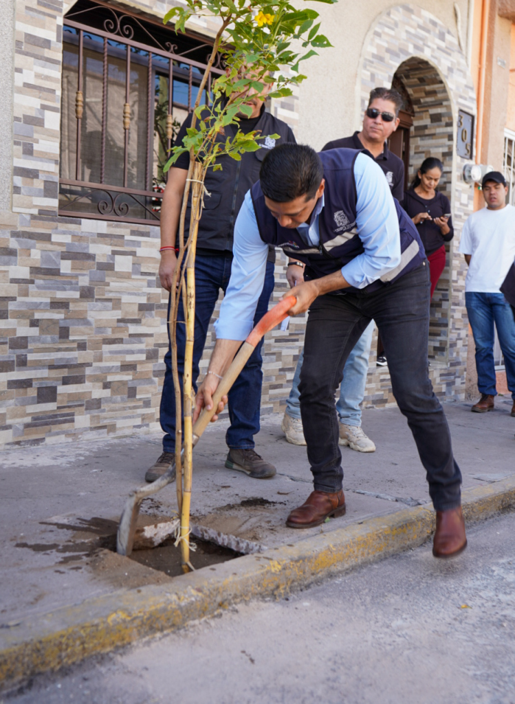 Para el arranque del programa Leo Montañez acudió a la calle 5 de Febrero en la Colonia El Llanito donde fueron plantados más de 20 árboles de especies como tronadora, trueno, astronómica que previamente habían solicitado vecinos del lugar.