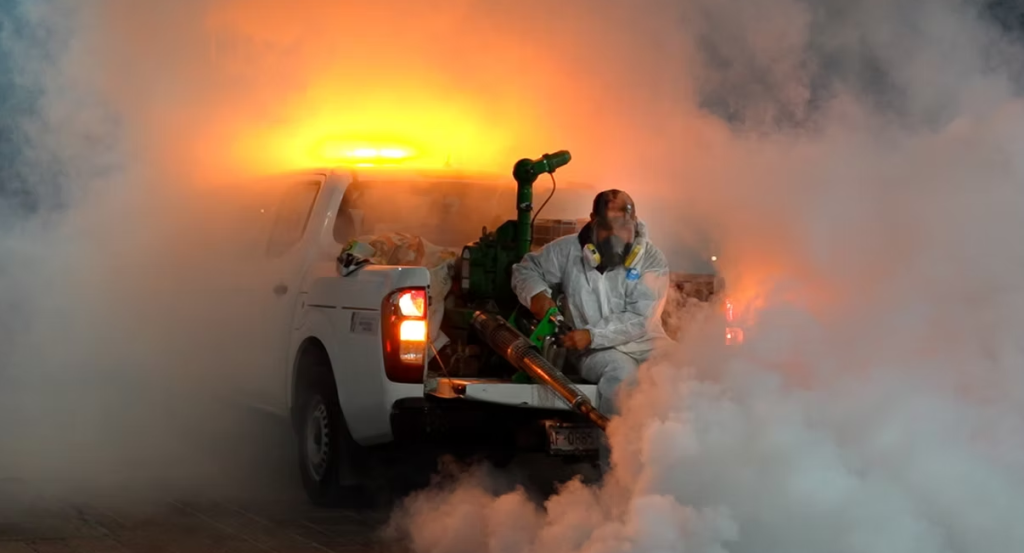 Como parte de la campaña que realiza la Secretaría de Salud en todo el estado para prevenir el dengue, se realizan acciones de fumigación en el perímetro ferial y colonias aledañas, previo al inicio de la Feria Nacional de San Marcos 2025.