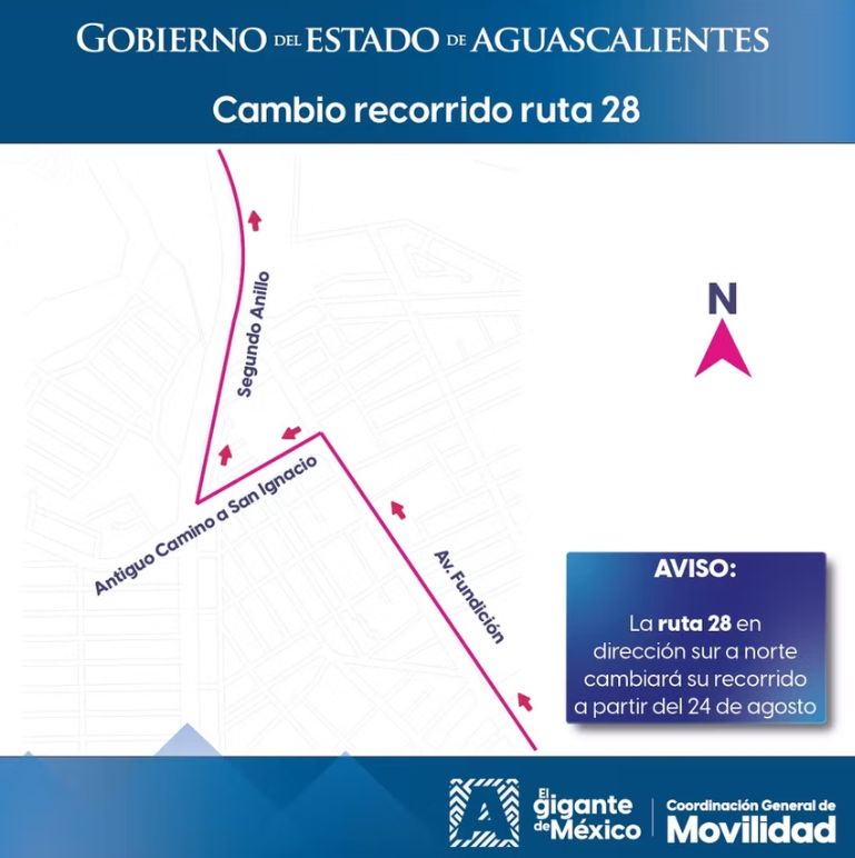 La Coordinación General de Movilidad informa que, a partir del domingo 24 de agosto, la ruta 28 del transporte público cambiará su recorrido en dirección de sur a norte.