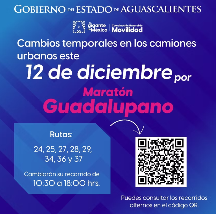 Debido al Maratón Guadalupano que se realizará el viernes 12 de diciembre, algunas rutas de camiones urbanos realizarán cambios temporales en su recorrido.